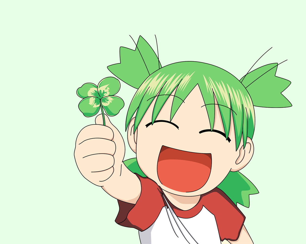 Description: A cartoon character with green hair and a red shirt holding a clover in her hand and smiling at the camera.