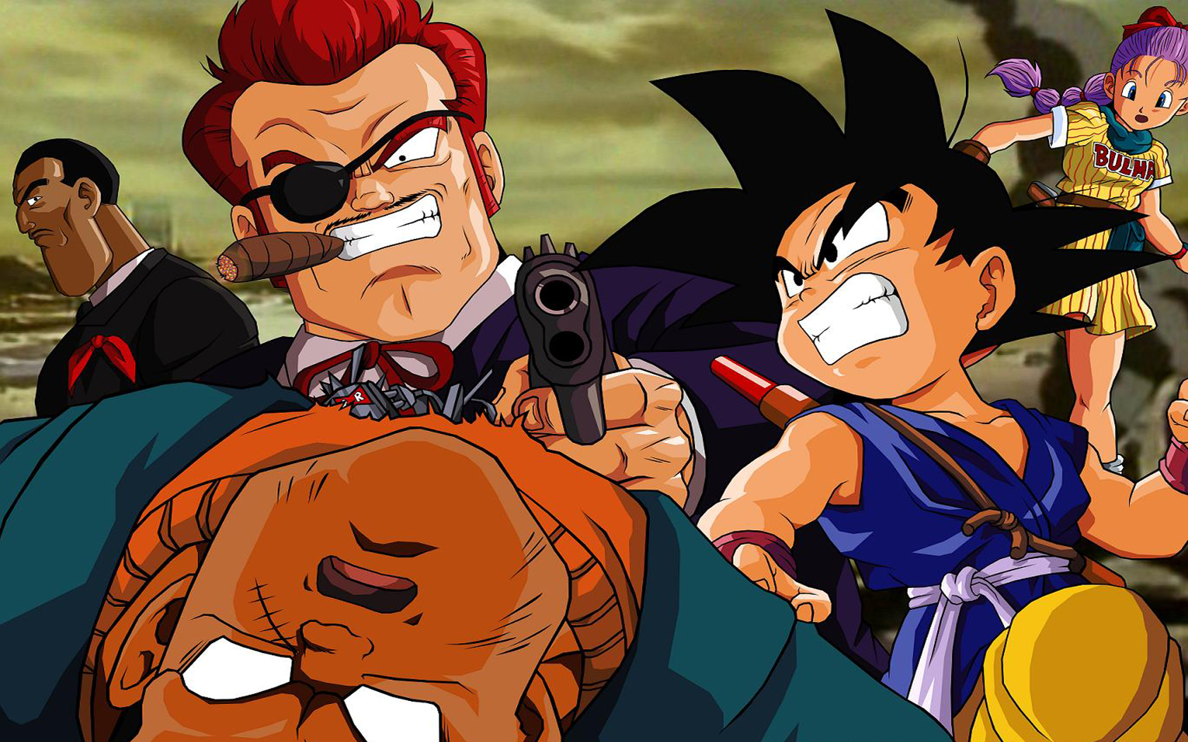 Description: A cartoon of a group of people with guns and a pumpkin in front of them.