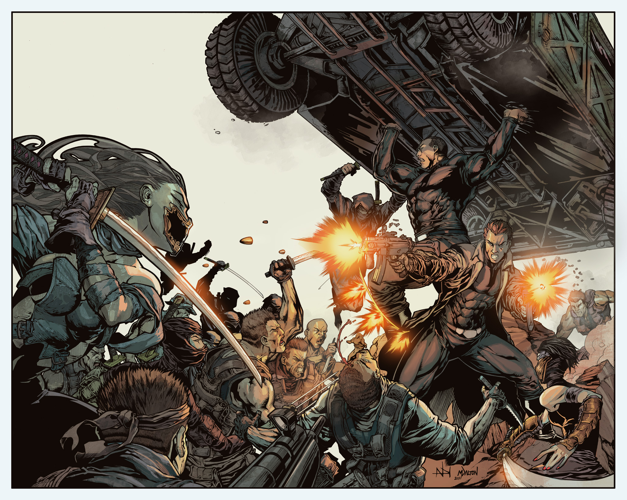 Description: A group of people in a cartoon with guns and a truck in the background with a giant truck in the foreground.