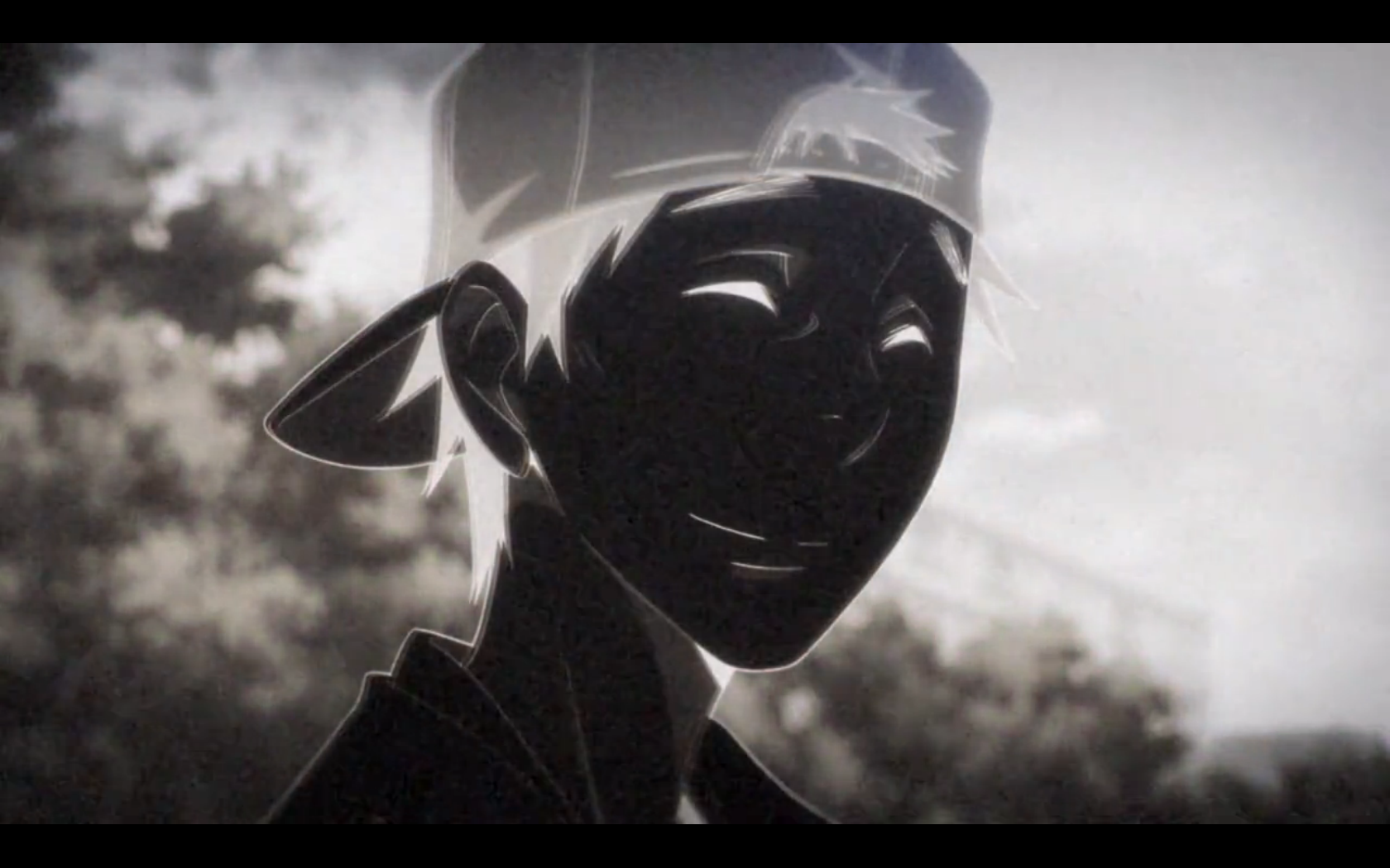 Description: A cartoon character with a hat on and a tree in the background with a sky in the background and a building in the background.