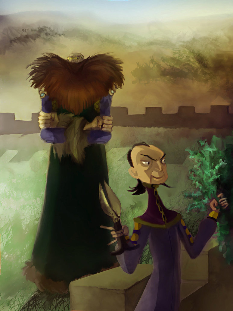 Description: A cartoon of a man holding a giant bird on his shoulder and a woman holding a knife in her hand.