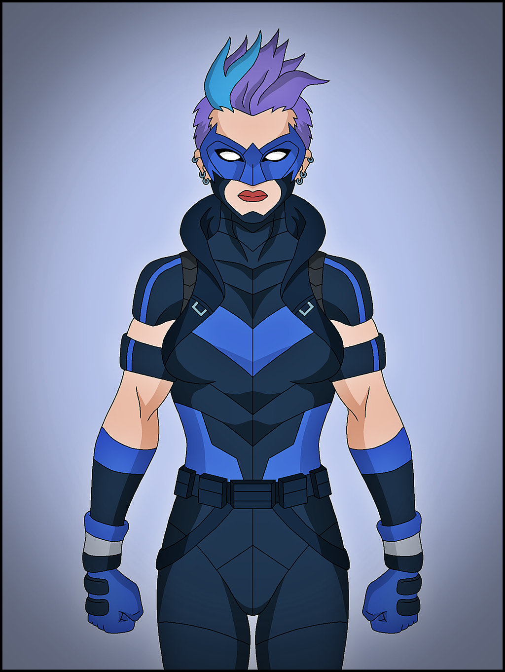 Description: A cartoon of a man in a blue and black suit with a blue mohawk and a blue mask on.