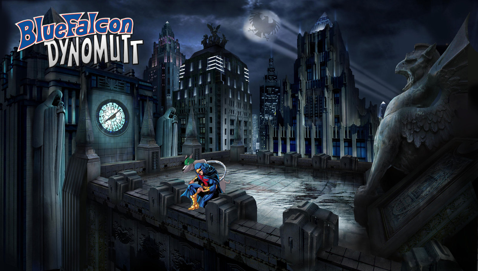 Description: A cartoon of a man on a bridge with a clock in the background and a city skyline in the foreground.