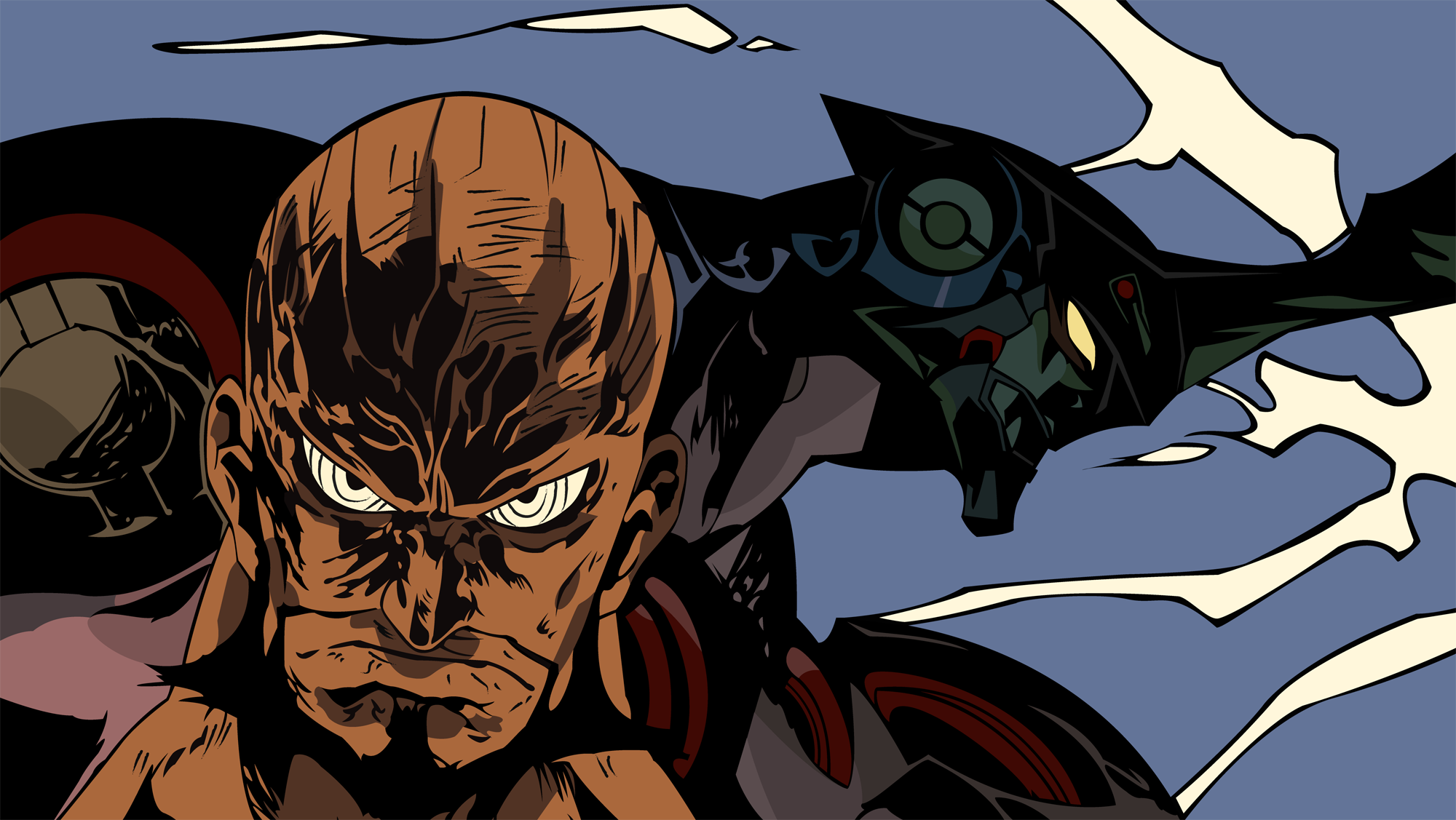 Description: A cartoon of a man with a demon face and a demon face on his chest.