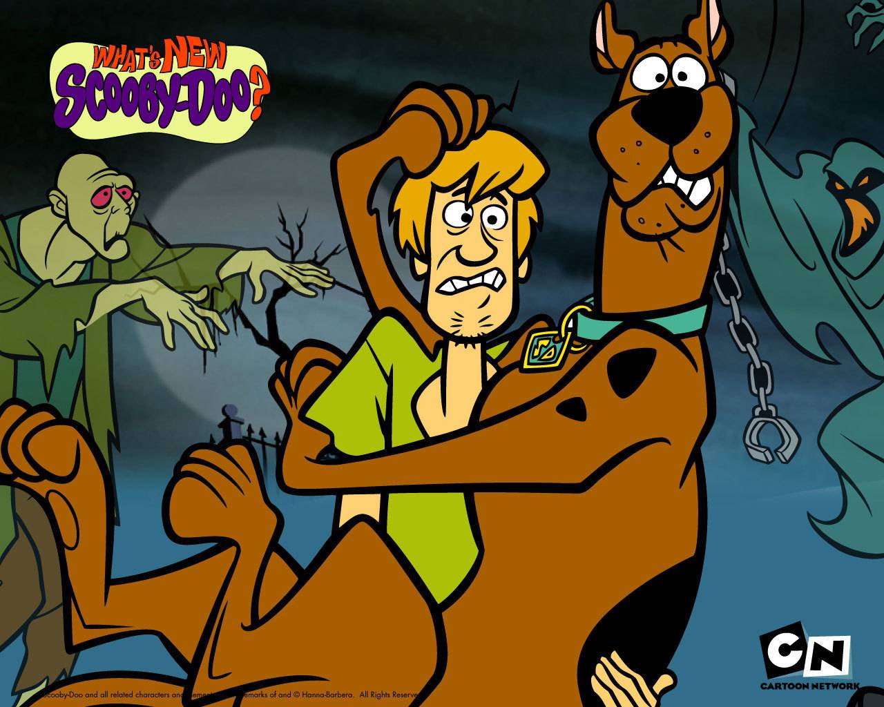 Description: A cartoon of a man and a dog with a ghost in the background and a man holding a dog.