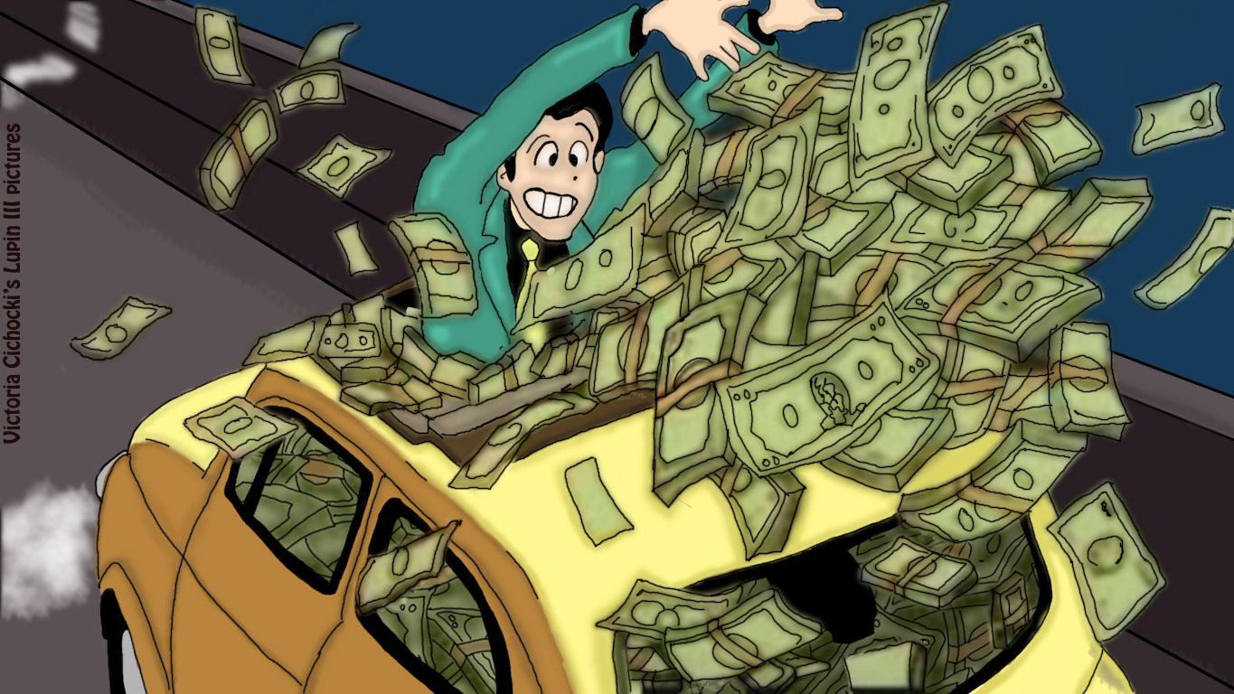 Description: A cartoon of a man falling from a car with money on top of him and a car with a lot of money on top.
