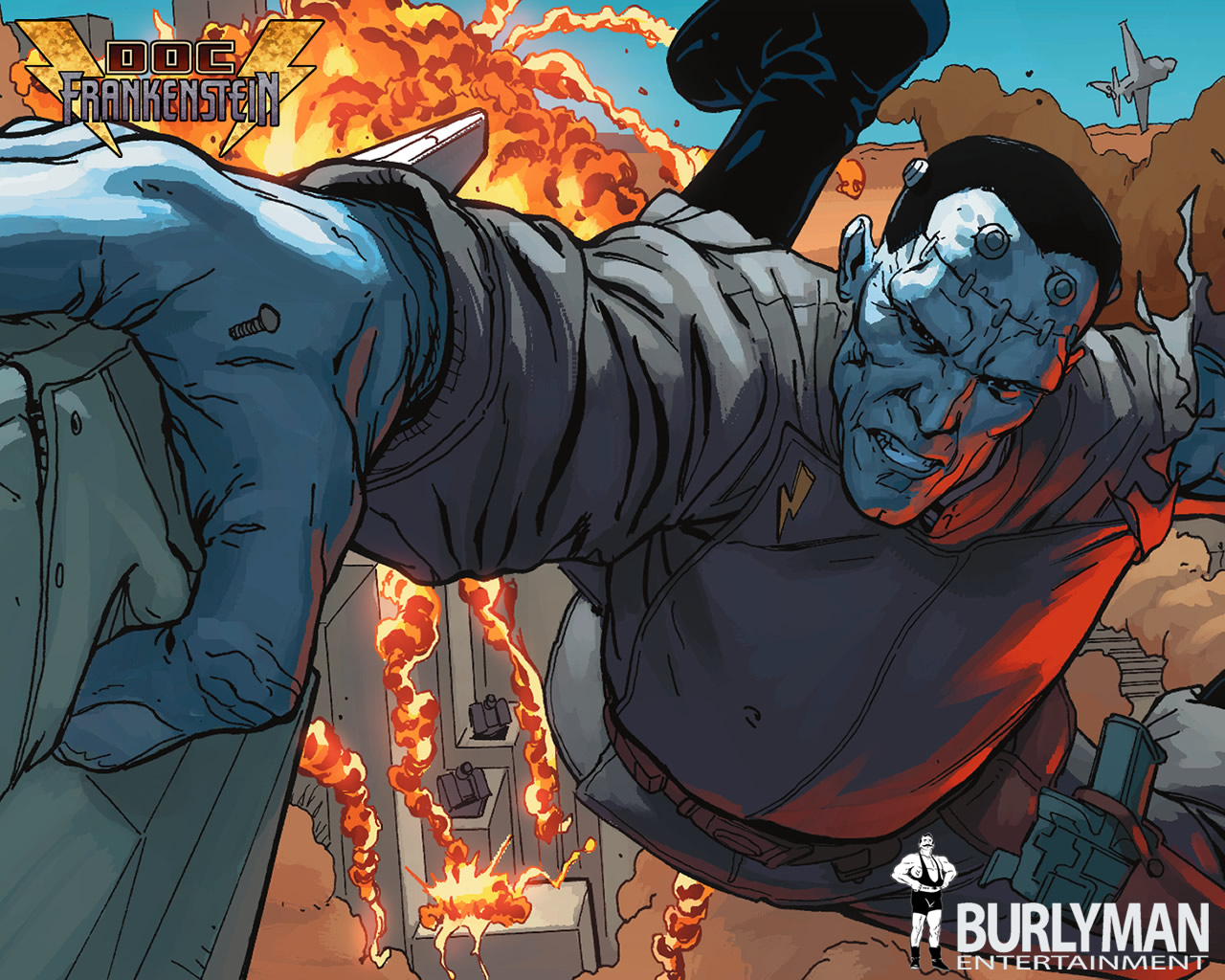 Description: A cartoon of a man with a knife in his hand and a fire in the background with a building in the background.