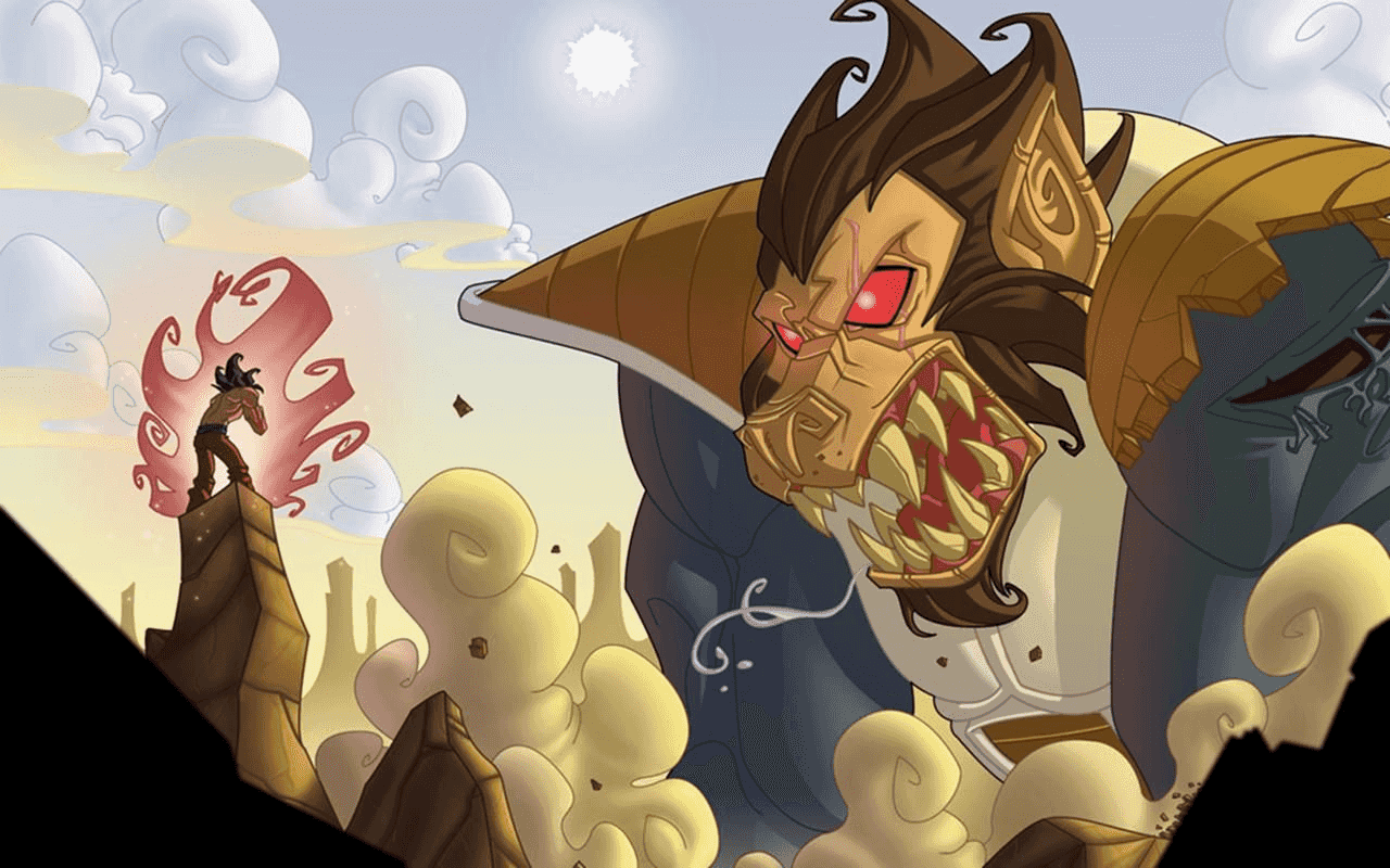 Description: A cartoon of a man with a sword in his hand and a demon in the background with a sky background.