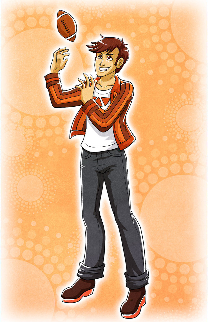 Description: A cartoon of a man throwing a football in the air with his hand and a ball in the air.