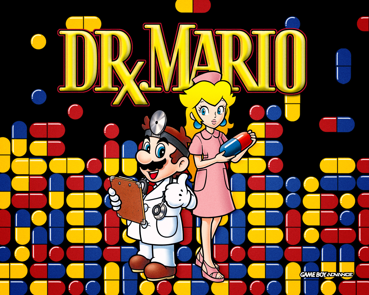 Description: A cartoon of a man and a woman standing in front of a wall of colored blocks with a title for dr mario.