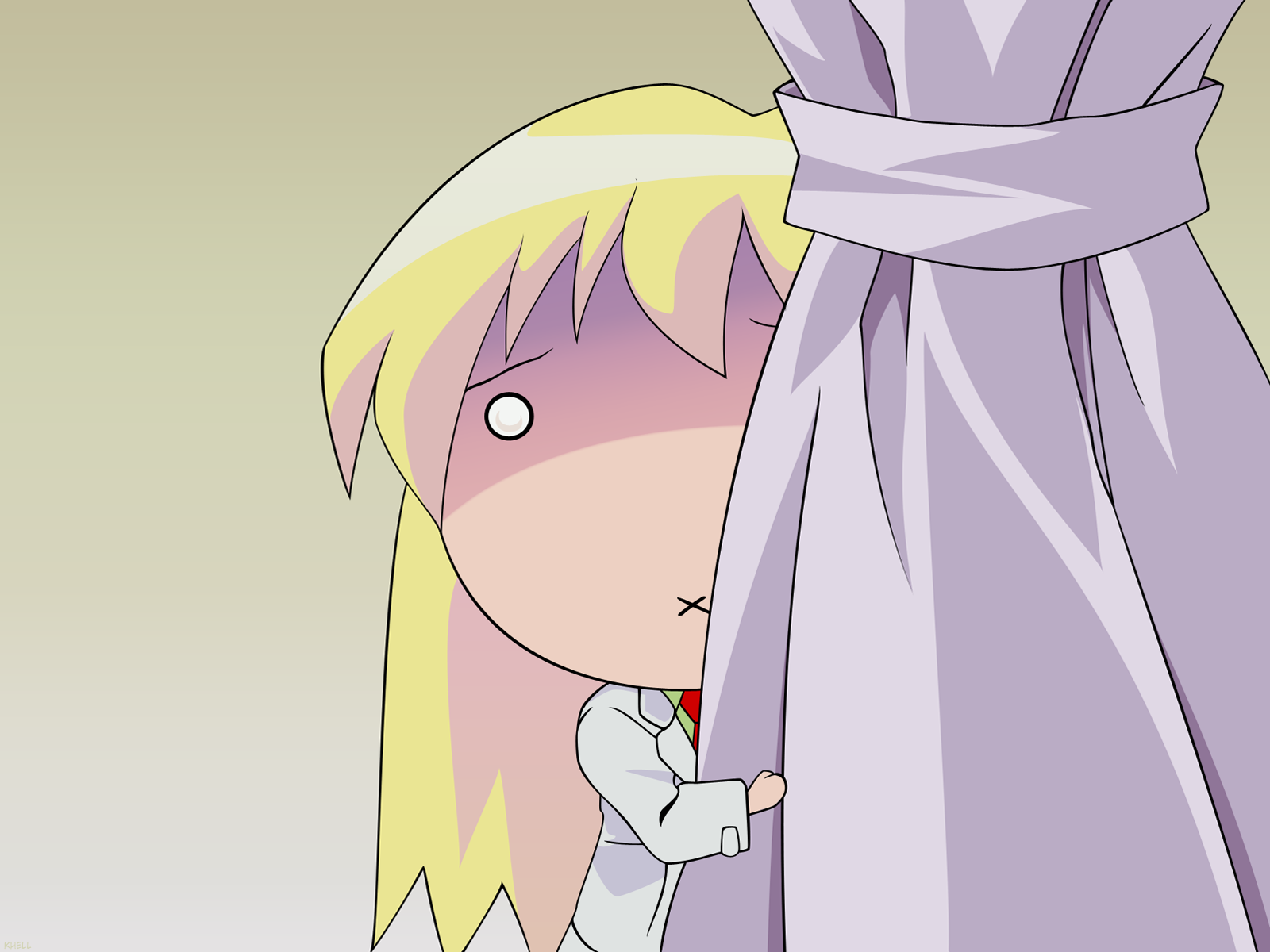 Description: A cartoon character is peeking out from behind a curtain with a red nose and yellow hair.