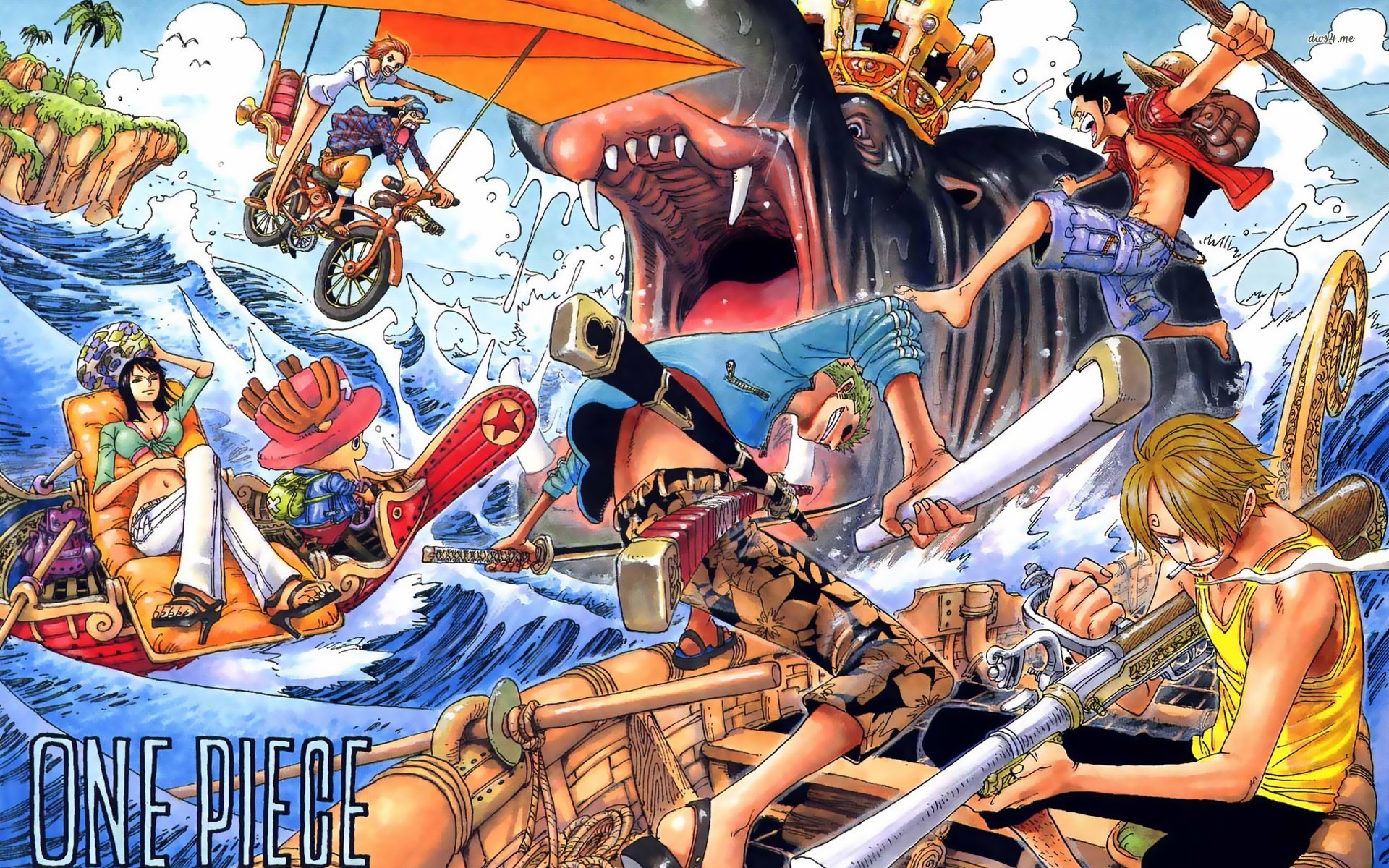Description: A cartoon of a group of people riding on a boat in the ocean with a shark in the background.