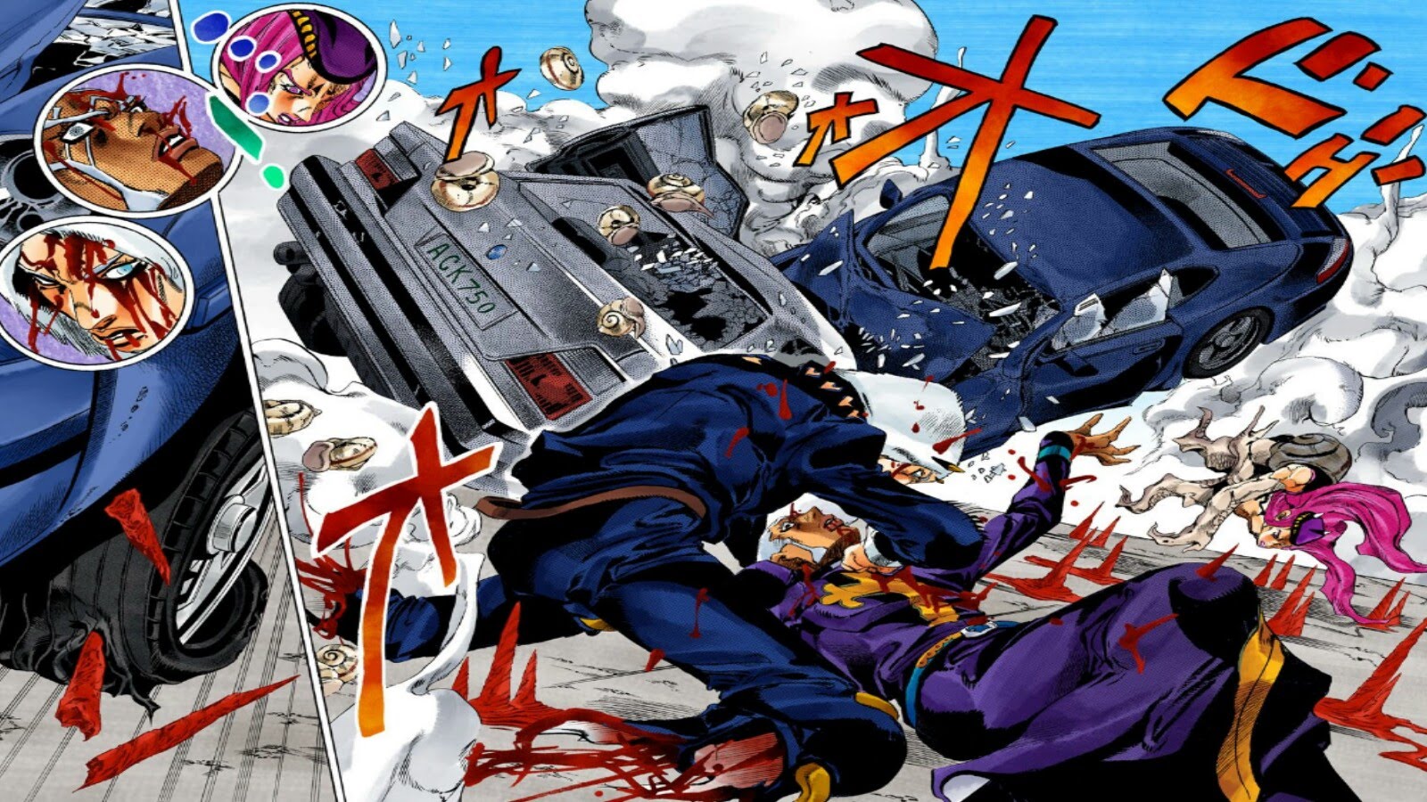 Description: A cartoon of a person on the ground with a car in the background and a bunch of other people around.