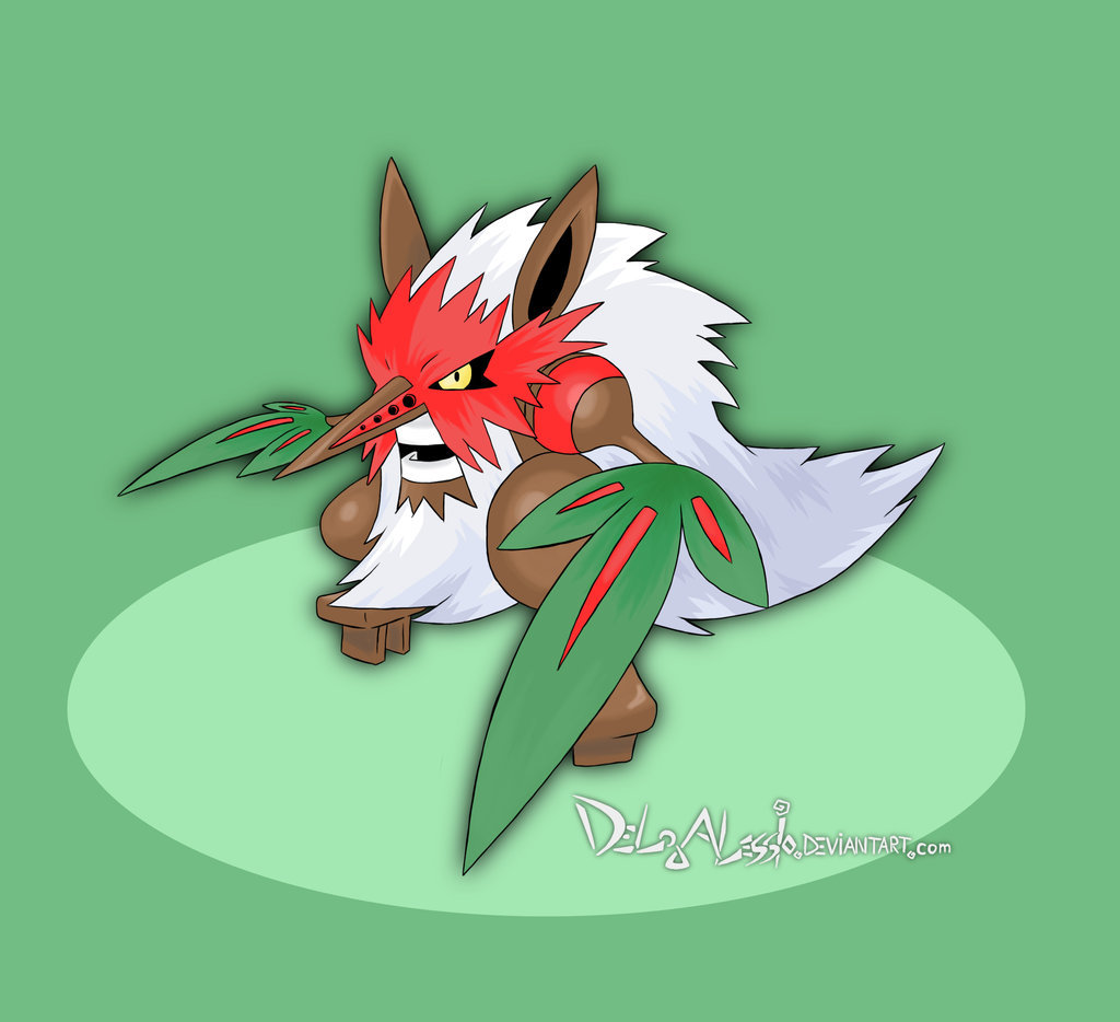 Description: A cartoon character with a red and white face and a green background with a green leaf in the foreground.