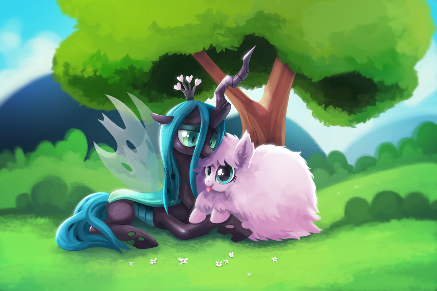 Description: A cartoon pony laying on the ground next to a tree and a cat with wings on it's back.
