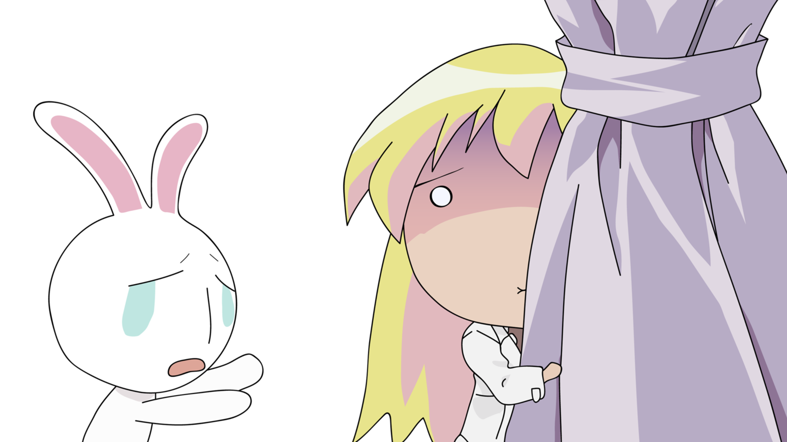 Description: A cartoon character with a rabbit standing next to her head and a curtain over her head.