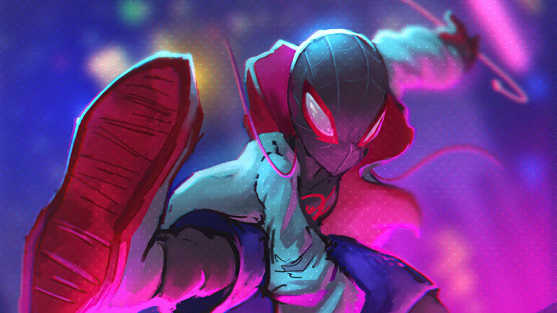 Description: A cartoon character with a red helmet and a purple background with a red and blue background and a red and white background.