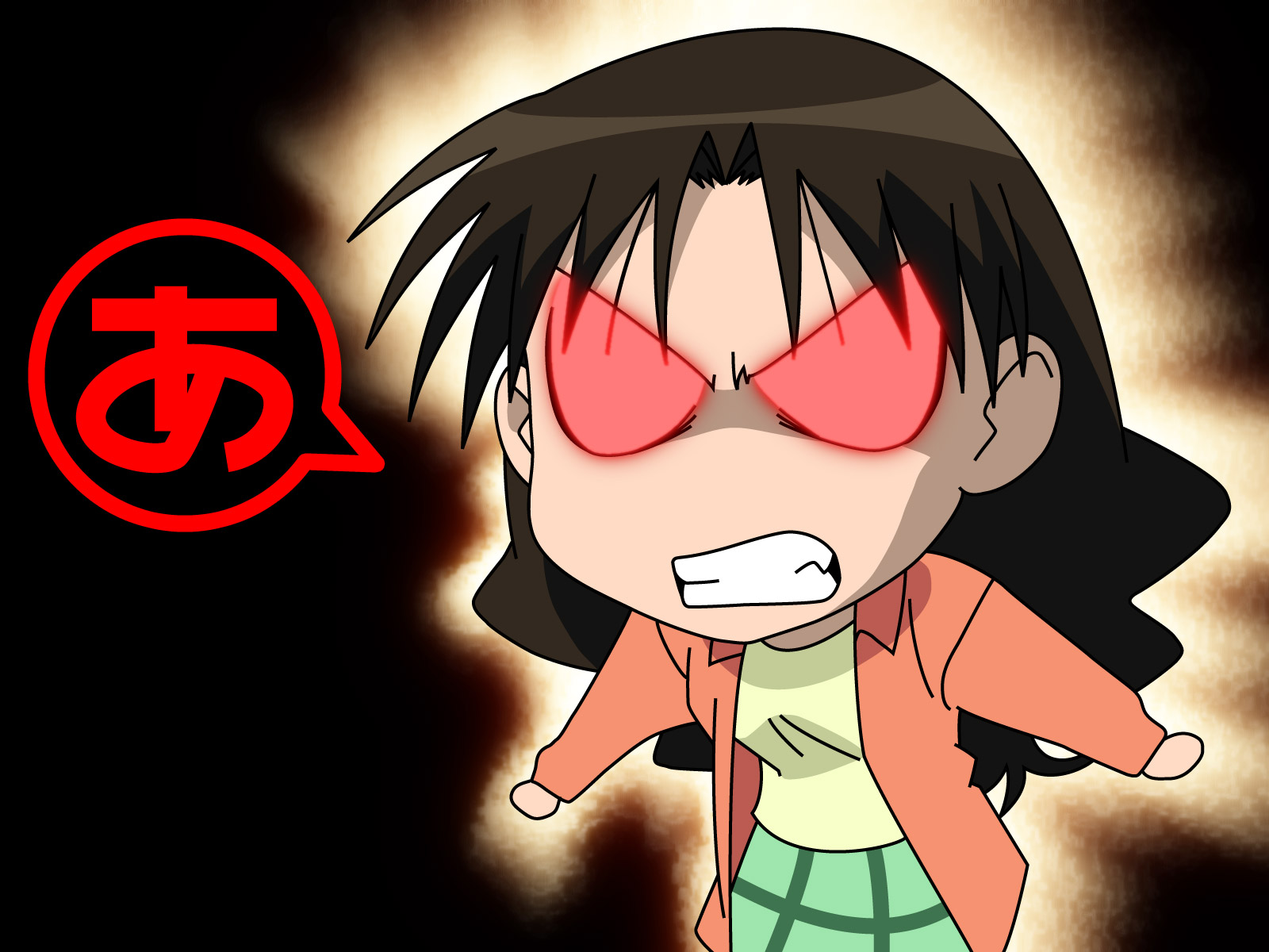 Description: A cartoon character with red eyes and a black background with a red circle around it and a red and white symbol.