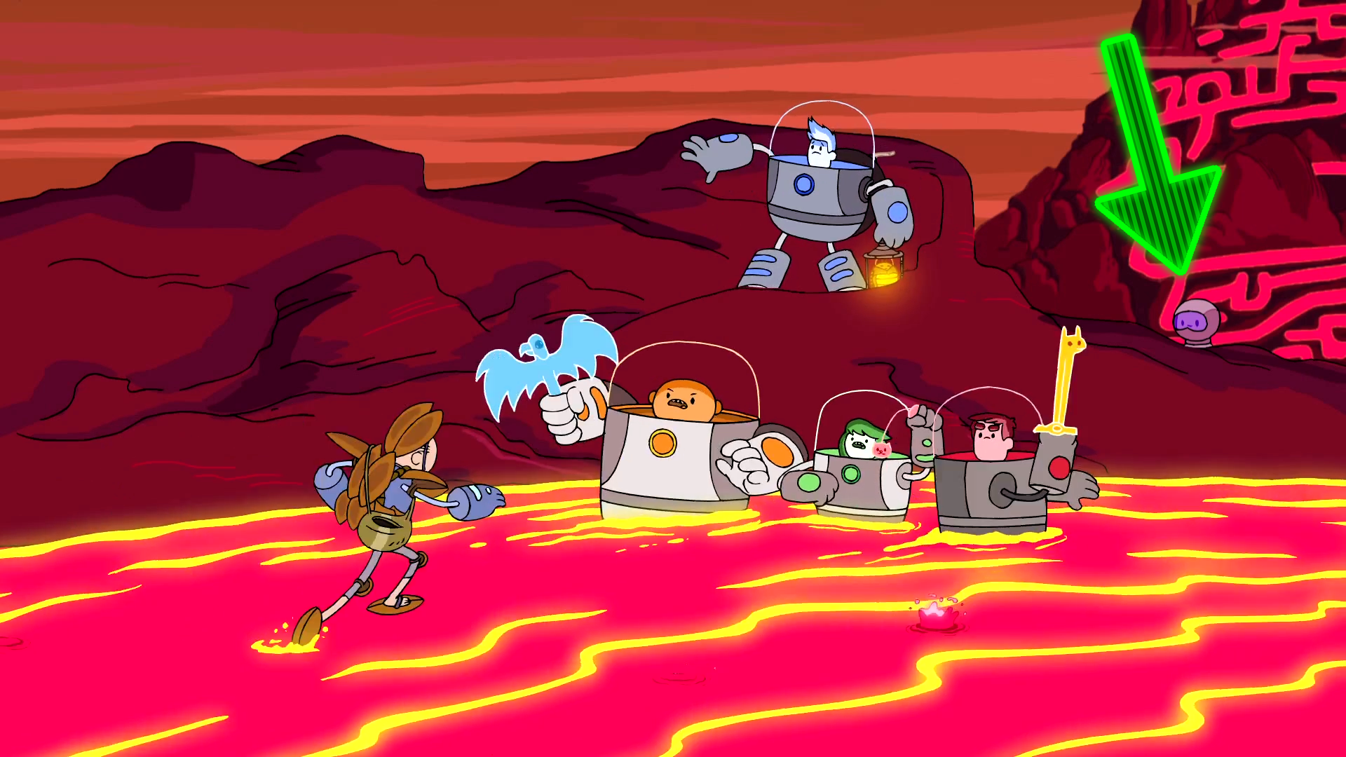 Description: A cartoon scene with a robot and a girl in the background and a man in the foreground with a green arrow pointing to a robot.