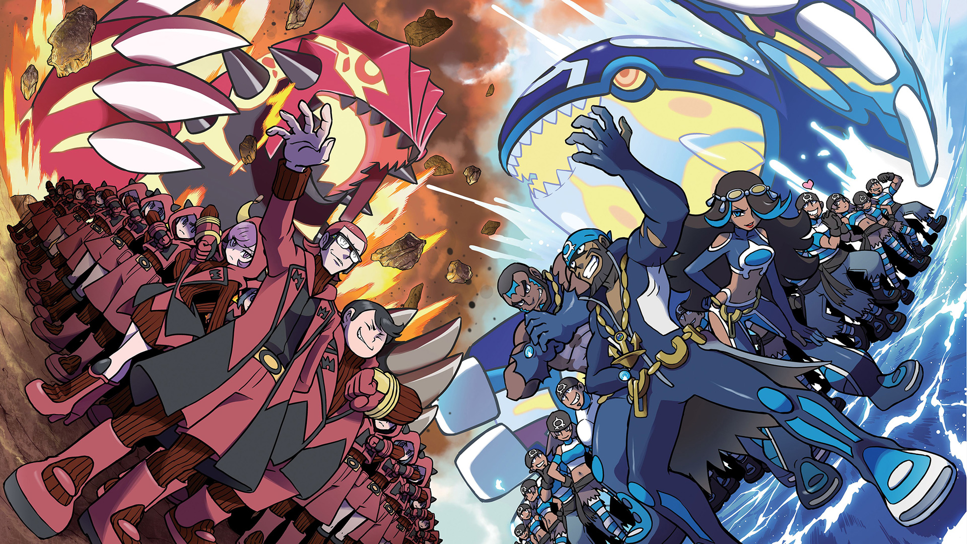 Description: A cartoon of a group of people riding on roller skates in front of a fire and water background.
