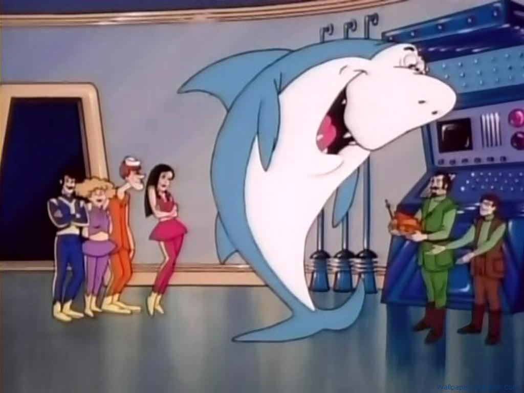 Description: A cartoon of a shark with people around it and a tv in the background with a man on the phone.
