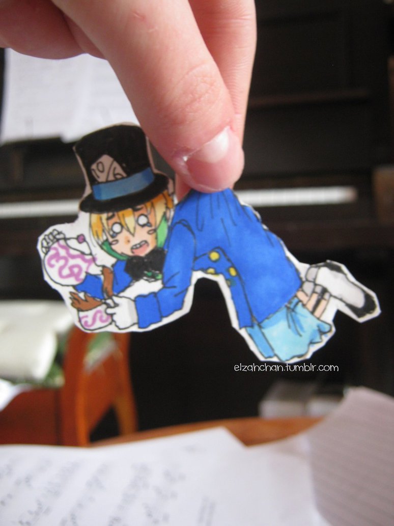 Description: A person holding a sticker of a cartoon character in their hand.