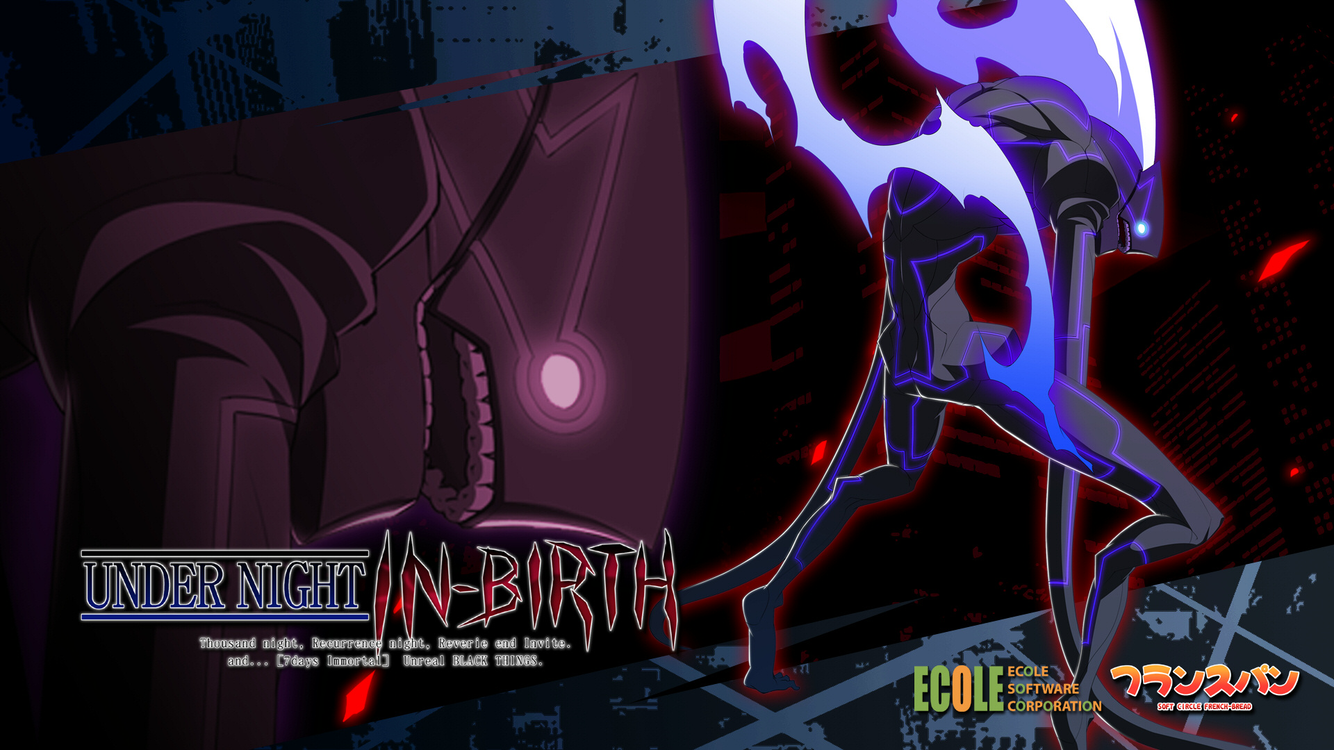 Description: A cartoon character with a sword in front of a giant purple object with a black background and a red light.