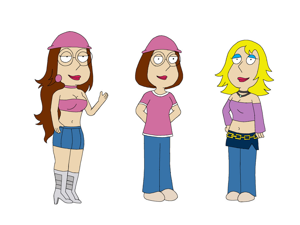 Description: A cartoon of three women in different outfits and one is wearing a pink shirt and blue pants and the other is wearing a pink shirt.