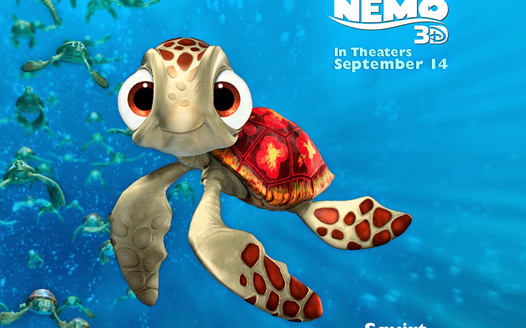Description: A cartoon turtle swimming in the ocean with a caption that reads nemo in characters'names.