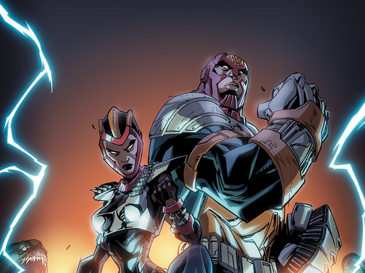 Description: A cartoon of two men standing next to each other in front of a lightning background with a black background.