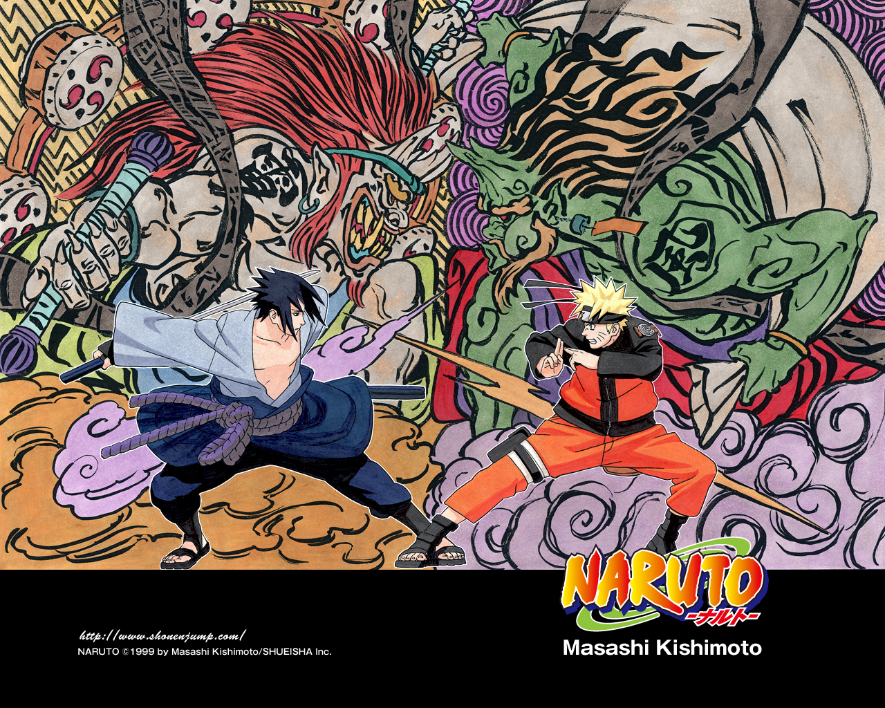 Description: A cartoon of two people in front of a painting of a demon and demon with swords in their hands.