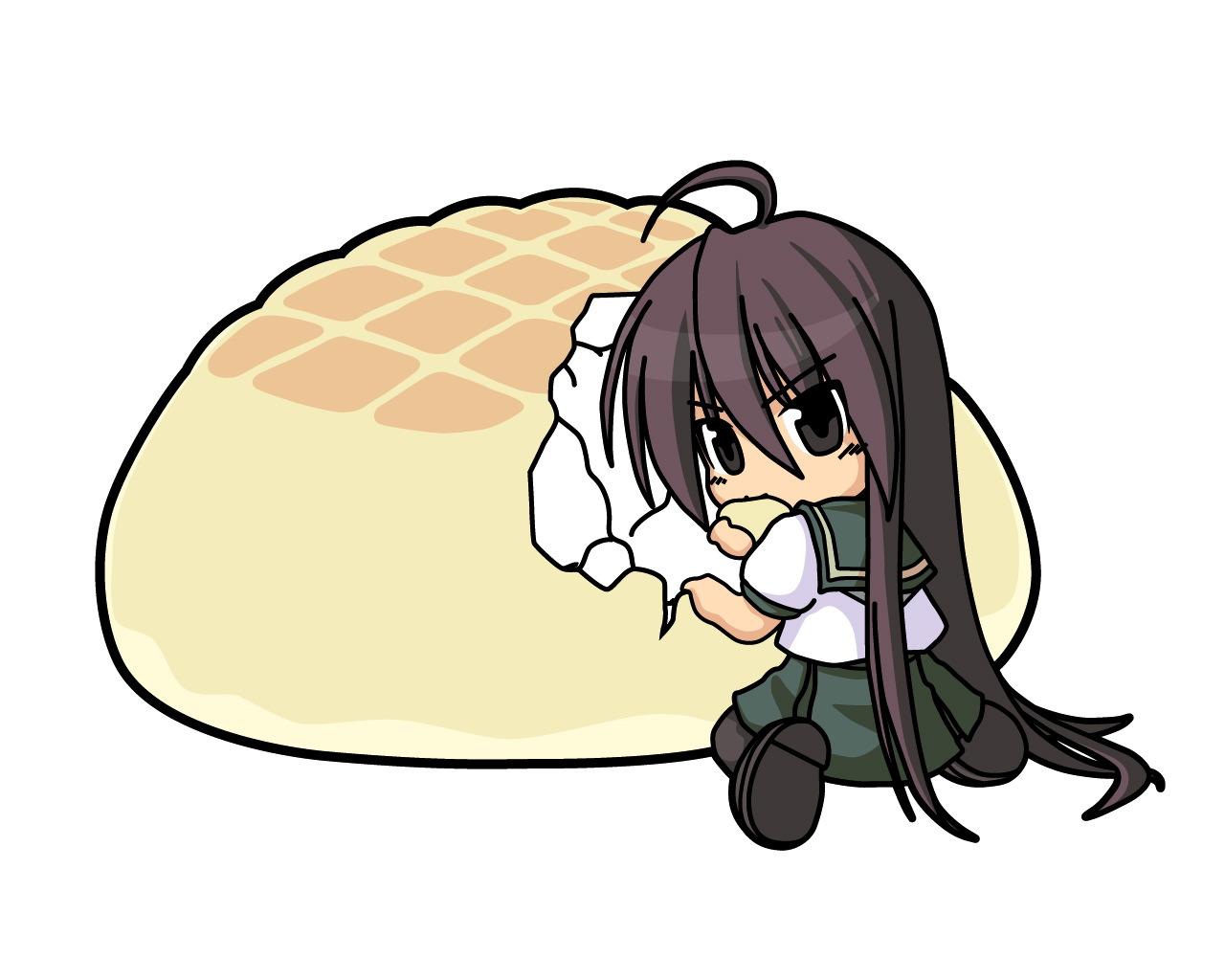 Description: A cartoon character holding a waffle on a white background with a long black hair and a white shirt.