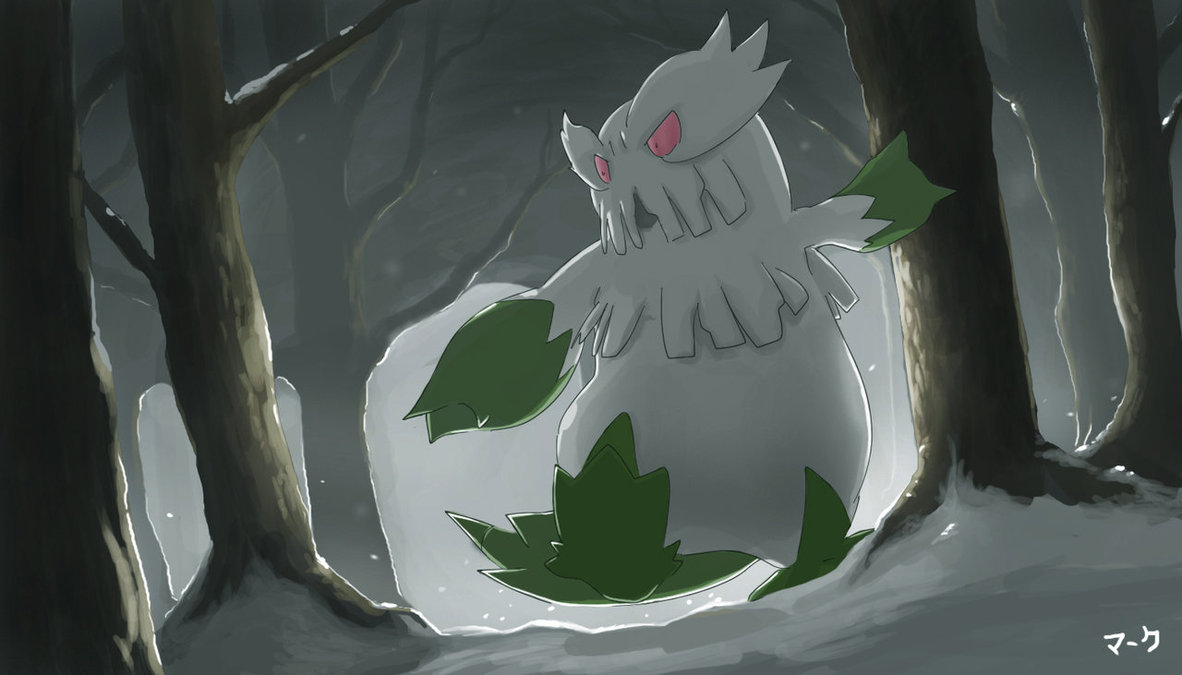 Description: A cartoon of a white creature in a forest with trees and snow on the ground and a red eye.