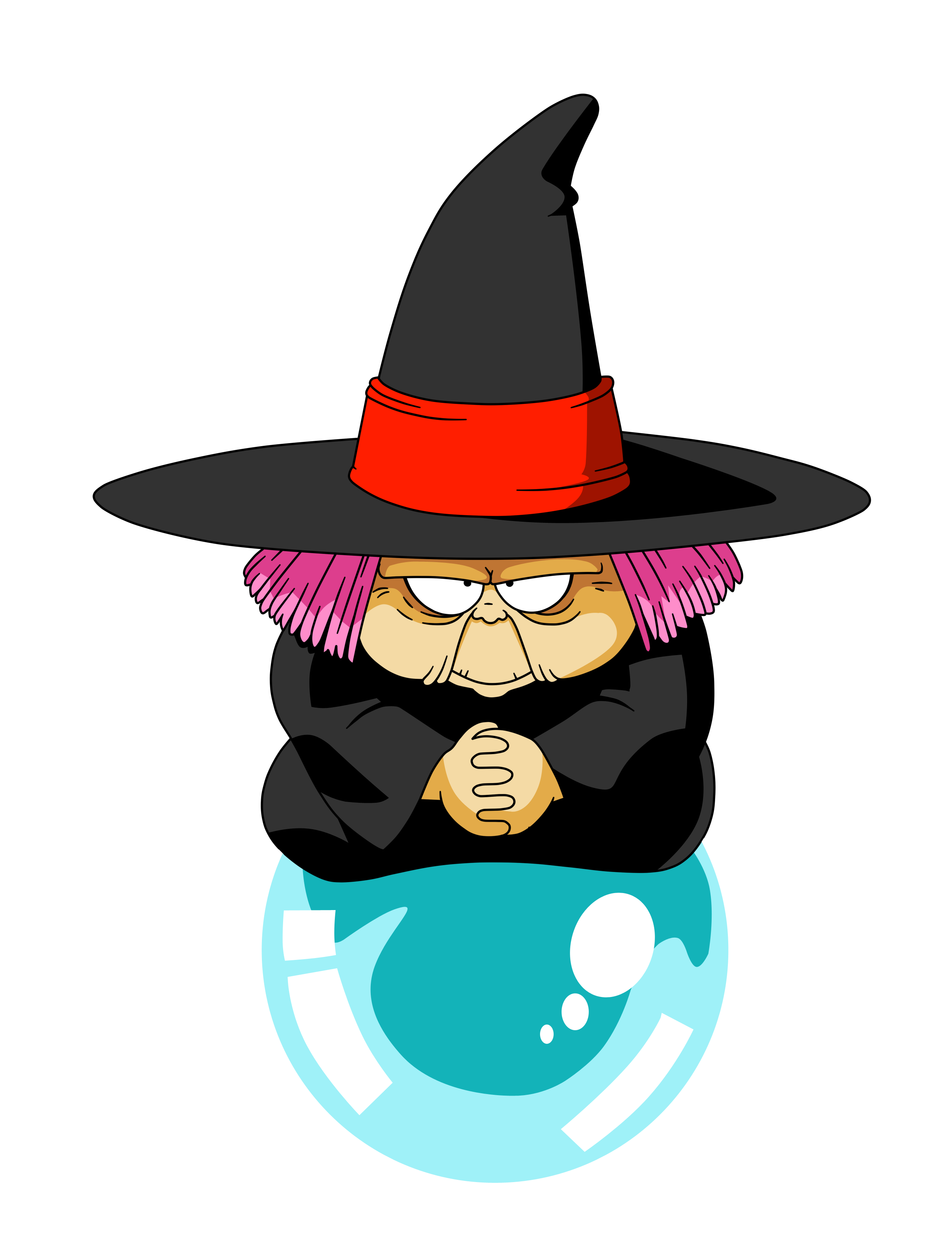 Description: A cartoon witch sitting on a blue ball with a black hat on her head and a pink tail on her head.