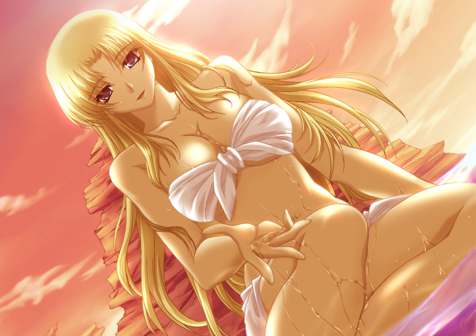 Description: A cartoon picture of a woman in a bikini on a beach with a pink sky in the background and clouds in the background.