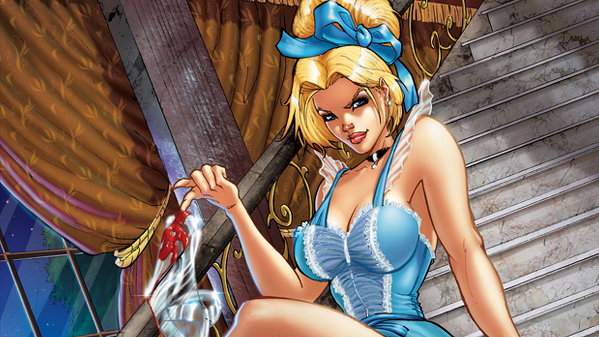 Description: A cartoon of a woman in a blue dress sitting on a stair case with a sword in her hand.