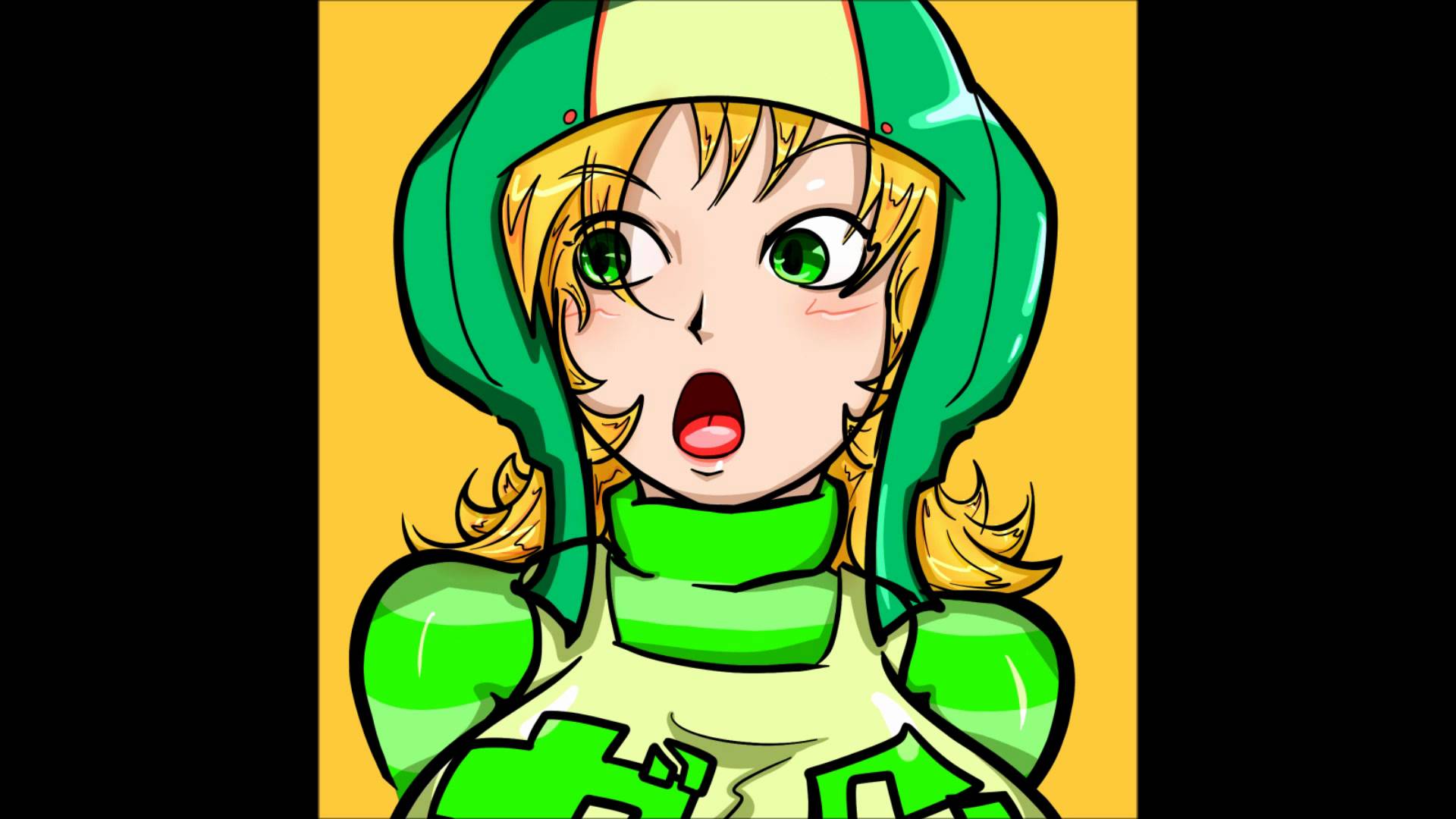 Description: A cartoon of a woman with a green hat and green and white dress and green and yellow background with a yellow background.