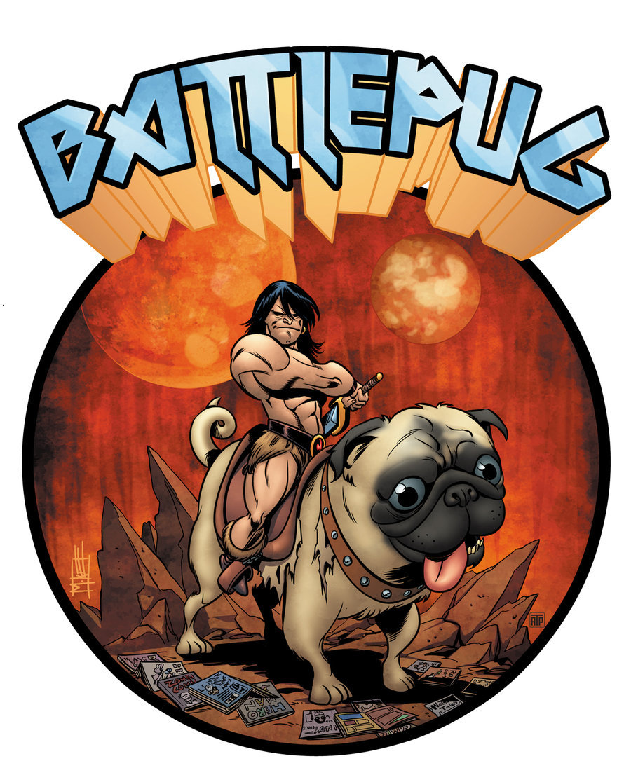 Description: A cartoon of a woman riding a pug dog with a sword in her hand and a caption that reads battleplus.