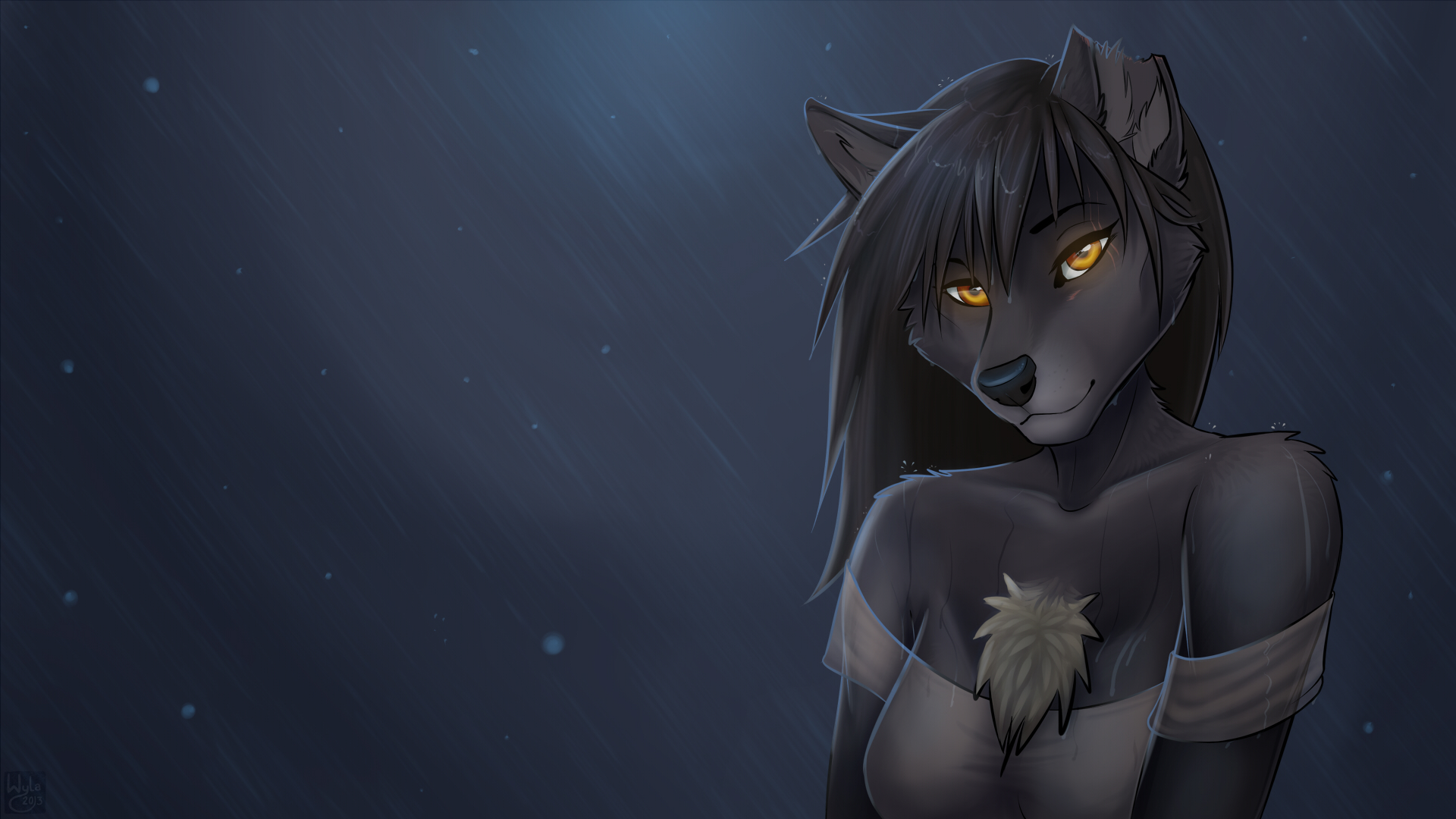 Description: A cartoon picture of a woman with yellow eyes and a wolf like outfit on.