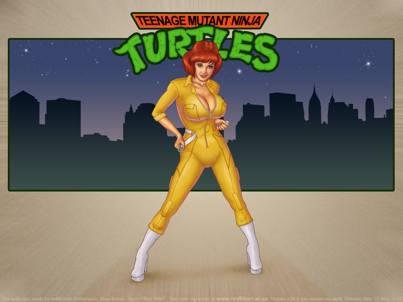 Description: A cartoon of a woman in a yellow suit with a teenage mutant ninja logo on her chest and a city skyline behind her.
