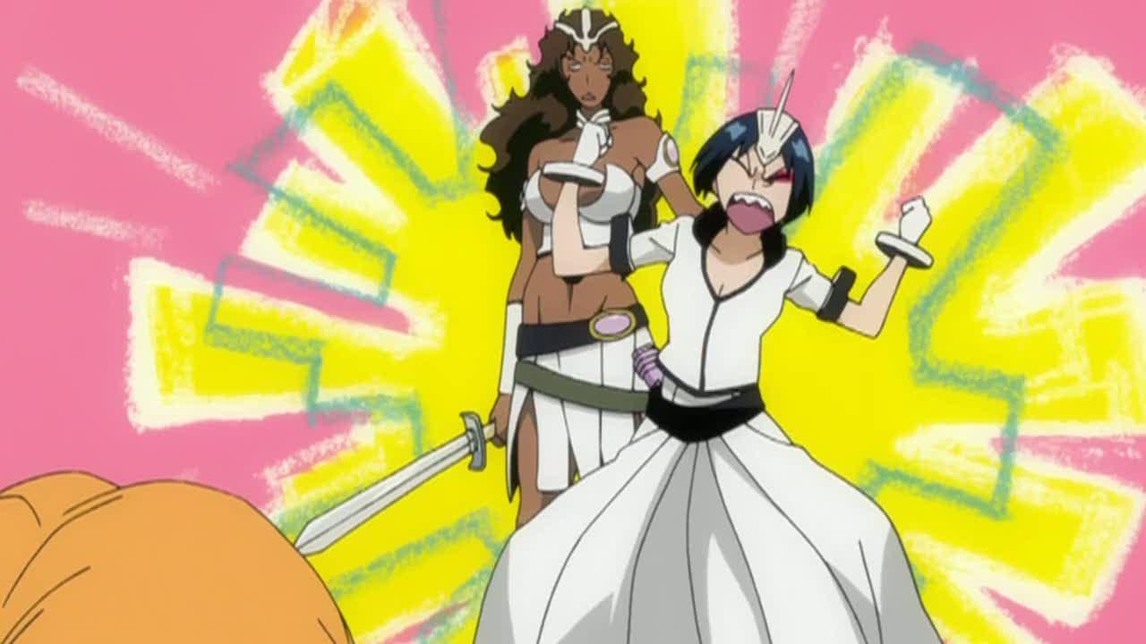 Description: A cartoon of two women dressed in costumes and holding swords in front of a pink background with yellow and pink streaks.
