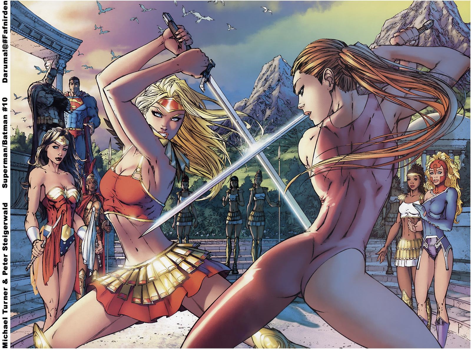 Description: A cartoon of a group of women with swords in their hands and a man in a suit behind them.