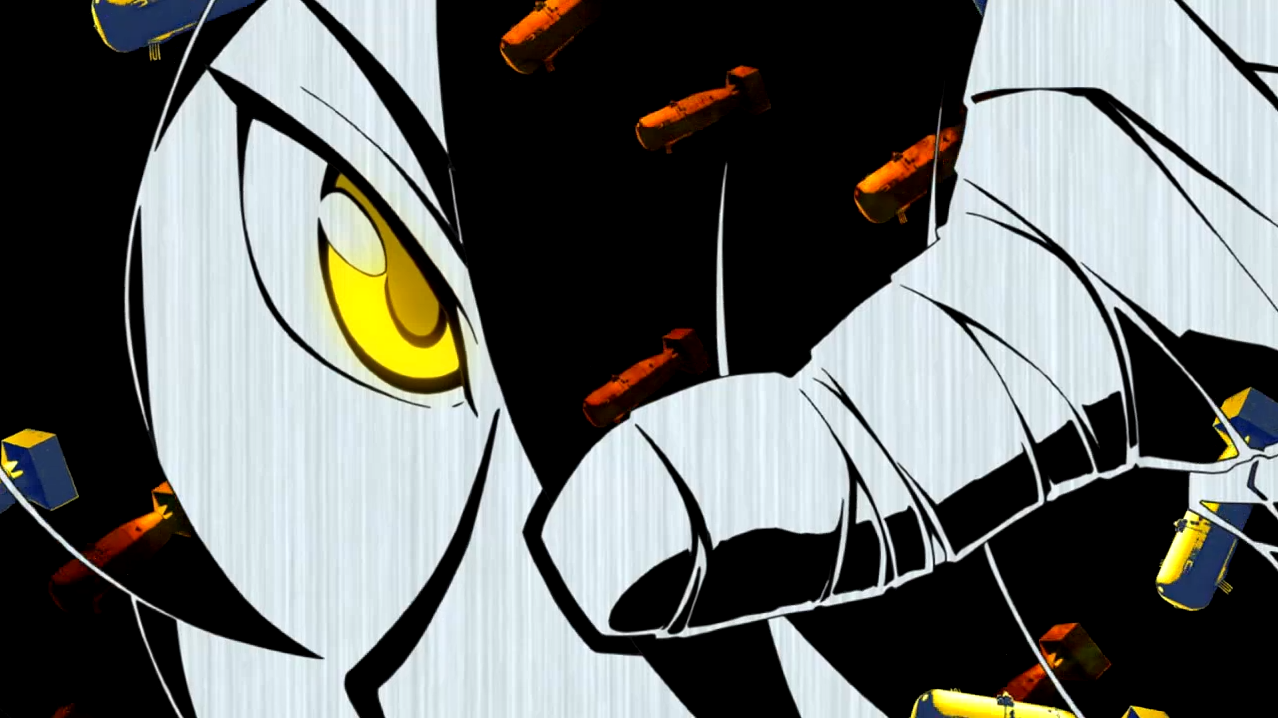 Description: A cartoon character with yellow eyes and a black background with yellow eyes and a white background with yellow and blue details.