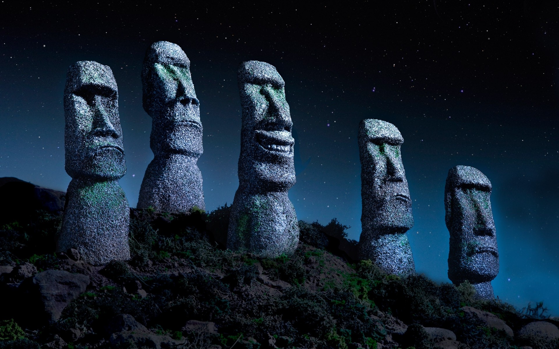 Description: A group of carved faces sitting on top of a hill under a night sky filled with stars and stars.