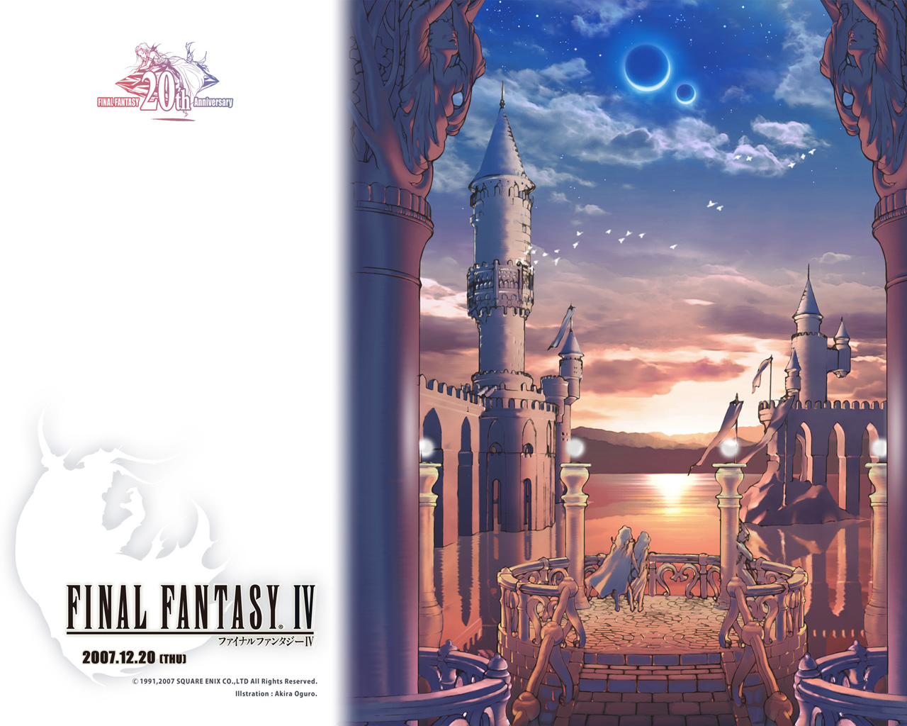 Description: A fantasy scene with a castle and a person in the distance with a blue sky and clouds in the background.