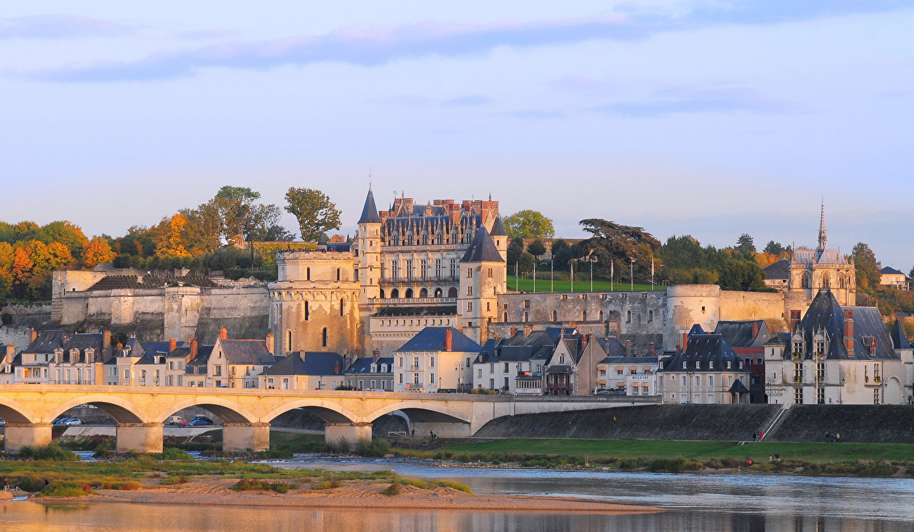 Description: A castle with a bridge over it and a river below it in front of a city with a bridge.