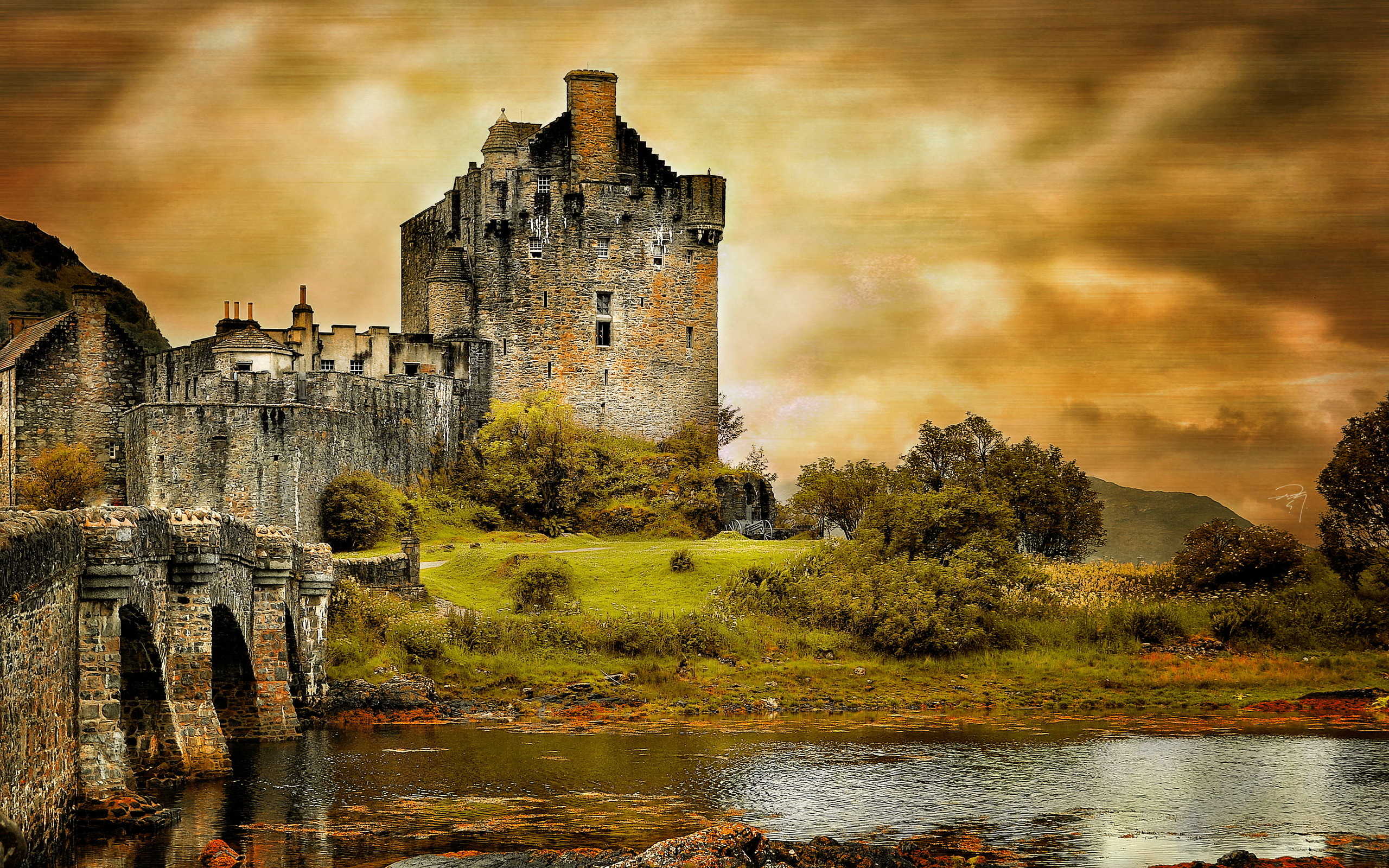 Description: A painting of a castle with a bridge and a river in front of it and a cloudy sky above.