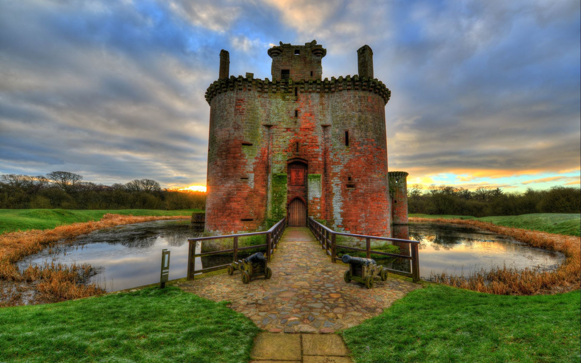 Description: A castle with a bridge leading to it and a body of water in front of it and a cloudy sky.