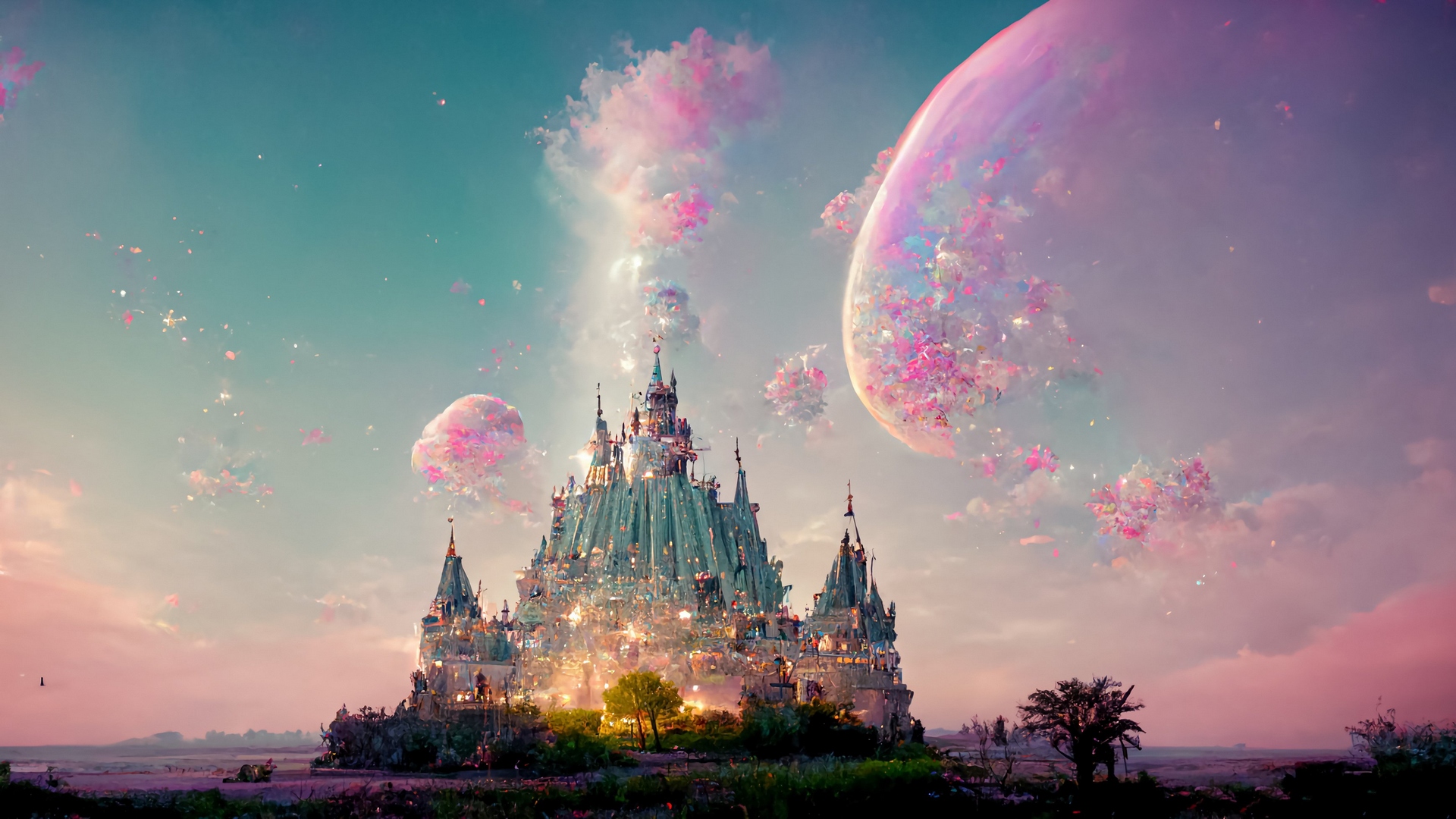 Description: A castle with a lot of bubbles floating in the air and a sky filled with clouds and stars above it.