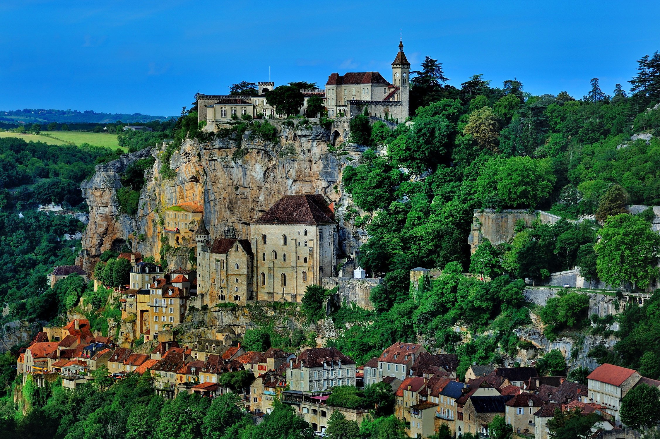Description: A castle on a cliff with a forest surrounding it and a blue sky above it.